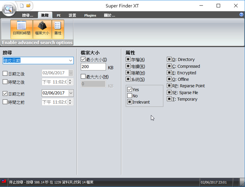在「進階」的地方可以設定更多條件,如修改日期、檔案大小、屬性等等,減少搜尋的時間,還有就是要切記,搜尋的時候最好不要開其他程式,會 lag 甚至當機,等於你要對著搜尋過程發呆,這還蠻討厭的,雖然它已經比 Windows 內部搜尋工具要快很多,但還是有不足的地方。