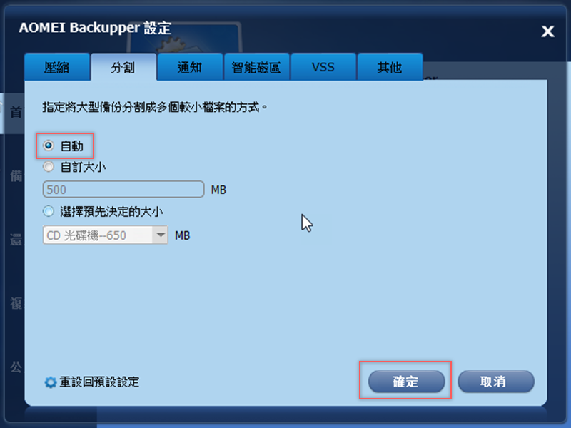 選擇要不要分割檔案,預設是自動,也可以自己再設定分割大小,好了就按「確定」。