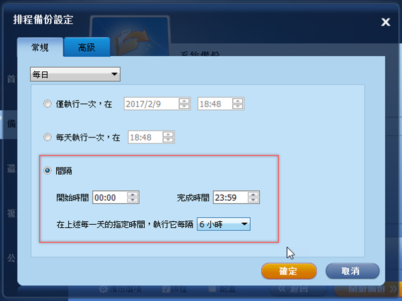 在排程設定裡面,常規設置的部分可以選每日或是間隔多少時間,執行次數等等,建議設定每日自動備份,免得突發狀況措手不及。