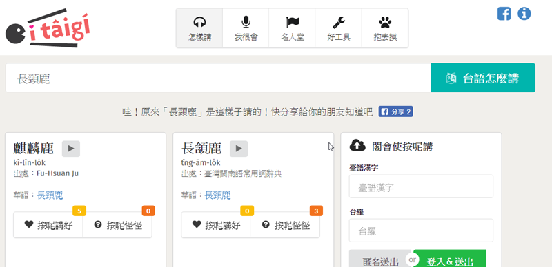 來輸入「長頸鹿」試試看,出現了兩種講法,下面有標示出處,第一個是網友的解答,第二個是出自台灣閩南語常用詞字典,你可以在下面表示意見,當然如果你知道其他講法,也可以在最右邊輸入來告訴大家。