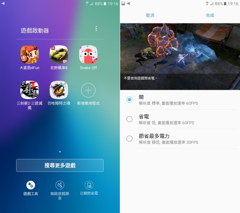 既然 Galaxy C9 Pro 那麼適合遊戲玩家,那麼有在玩手遊的朋友就別忘了要善用遊戲啟動器,有遊戲工具及省電模式可以使用。