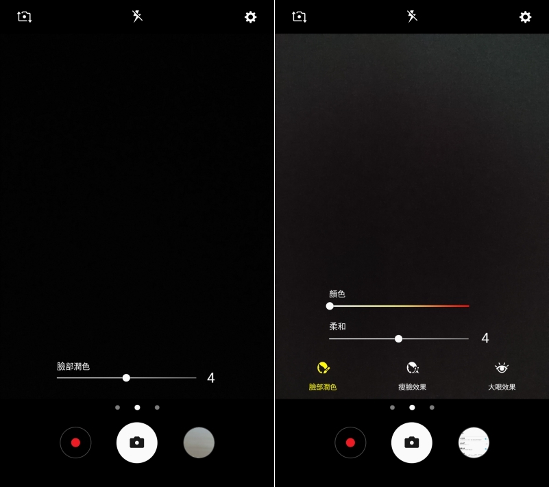 在美肌的部份,如果你是使用後面的主鏡頭,只能調整臉部潤色,若是前置鏡頭則還能調整更多細節的部份,例如瘦臉、大眼。