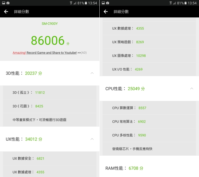 透過安兔兔跑分獲得 86006 分,差不多就是中階手機該有的水準。