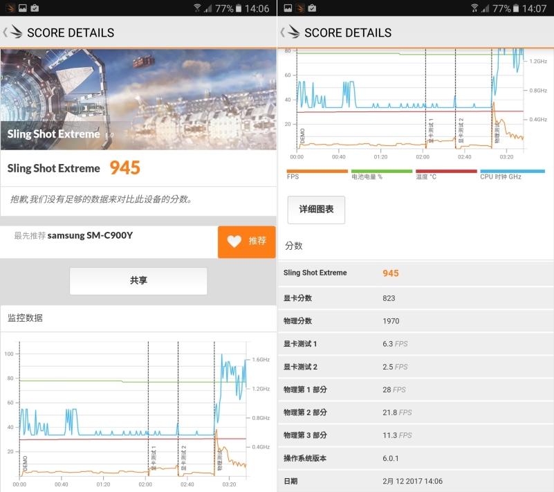 3DMark 透過 Sling Shot Extreme 測試獲得 945 分。