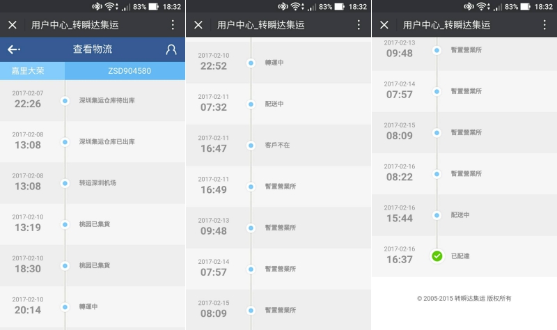 由於紫外線牙刷消毒器不直送台灣,所以我這次一樣是透過私人集運,用的是很多人都在用的轉瞬達,基於上次用的還不錯,所以這次一樣繼續採用,結果這次被台灣這一端的嘉里大榮快遞卡了好幾天,2/11 號配送時因為電話錯誤所以貨物返回營業所,同時當天就已經請轉瞬達更正,結果接下來無止盡的看到一直暫置營業所不派件,就這樣經過五天後才在 2/16 收到,雖然轉瞬達一直都有催件,但我真的不知道要怪誰了。