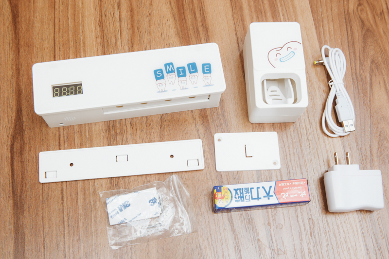 包含牙刷紫外線消毒器,擠牙膏架,USB 電線,變壓器,以及固定用的二片壁架跟固定用的 3M 雙面膠或者你要鑽牆的話,也有提供螺絲。由於有人反應雙面膠好像不夠力,所以店家隨機現在都有附一個萬能膠,讓你補強用。