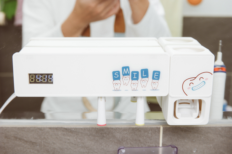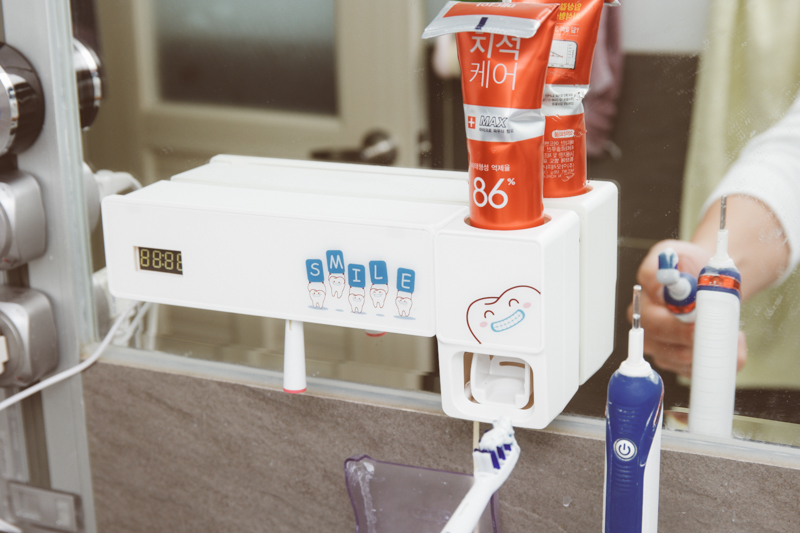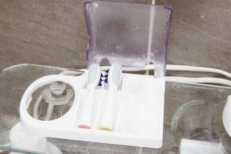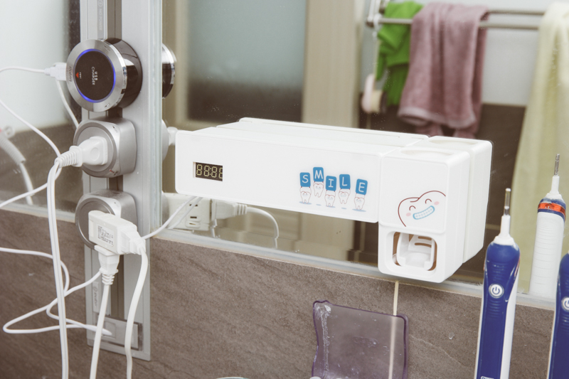 我們家中是用電動牙刷,所以一般需要放的只有牙刷頭,但因為平面的關係,就會像這樣,每一陣子就會殘留水坧等看起來髒髒的,我猜細菌可能也不少...