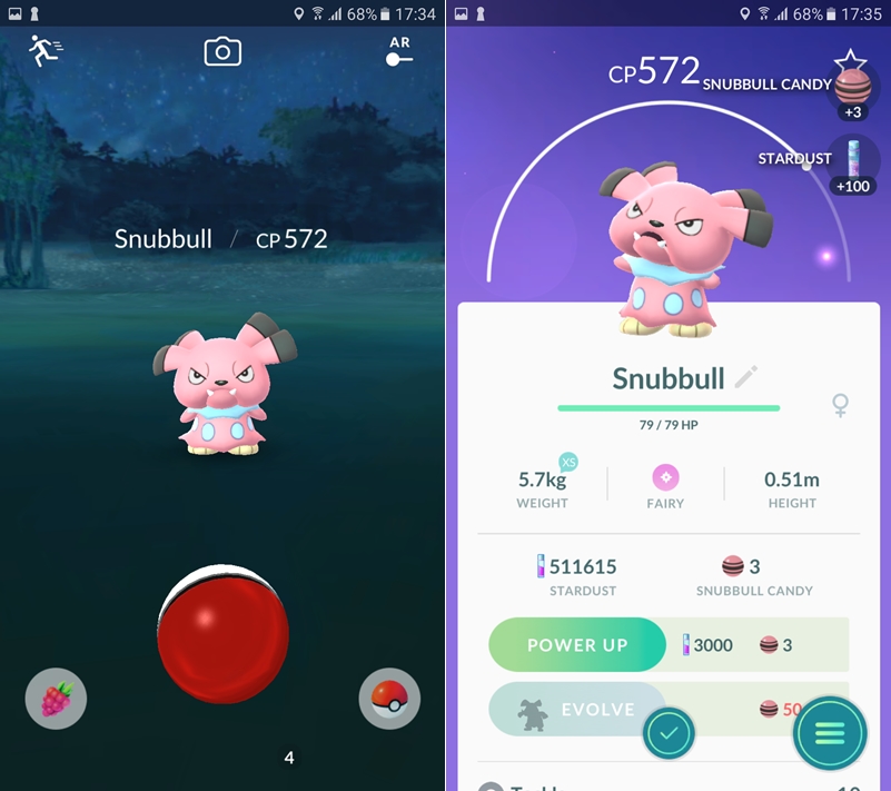 馬上跳出一隻 Snubbull(布魯),是妖精系的女生,長得有點好笑,兩個球就抓到了。