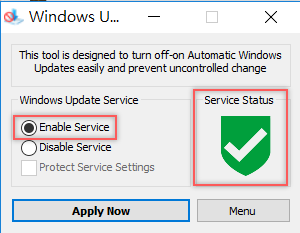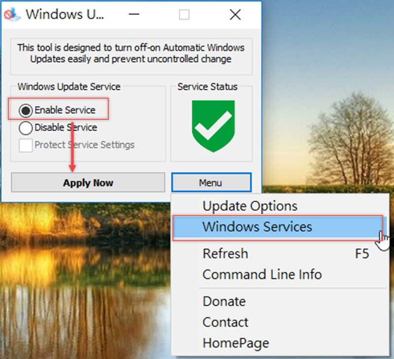 如果要改回來,再按「Enable Service」→「Apply Now」,就會繼續幫你自動更新,不過你還可以設定其他模式,點「Menu」中的「Windows Services」。