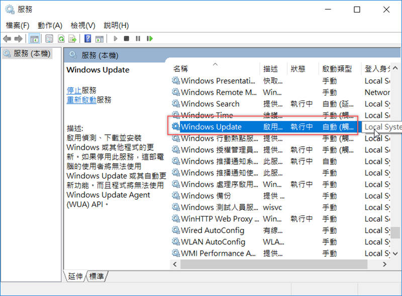出現服務選單,往下滑到「Windows Update」,可以看到現在是啟用自動更新的狀態,點開來看看。