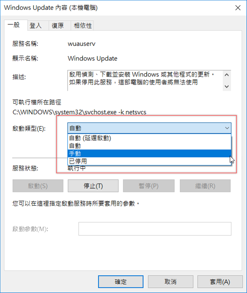在「啟動類型」這裡,可以改成「手動」,套用後確定,這樣你既可以知道什麼時候需要更新,也可以防止自動執行。
