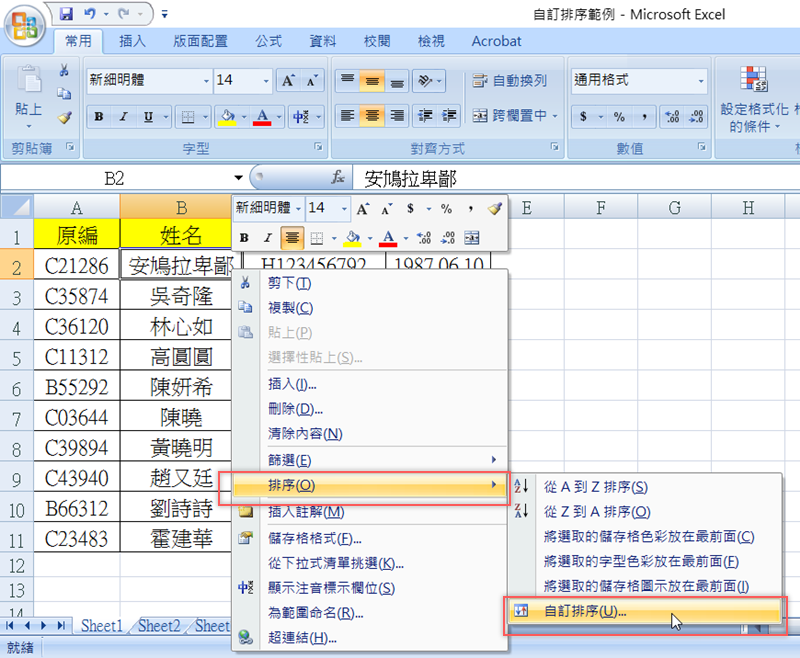 開啟 Excel 檔,假設現在要處理的是姓名欄位,原本照姓氏筆畫排列,所以姓「安」的人會在第一個,但這不是正確的順序,我們就在姓名欄位的第一位按滑鼠右鍵,選擇「排序」→「自訂排序」。