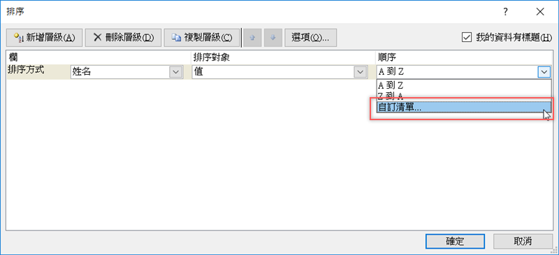 對一下欄與值沒錯的話,就到順序這邊選「自訂清單」。