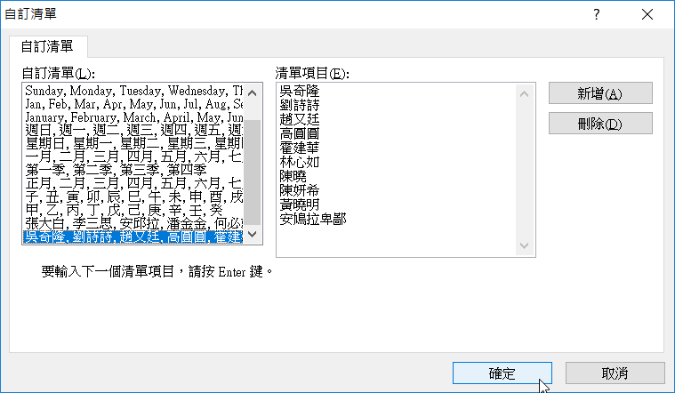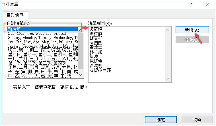 左邊的一大排清單,預設有星期幾、月份、甲乙丙丁等等,看看有沒有你要用的,如果沒有就自訂新清單吧,在清單項目這裡打上你要排序的內容,每打一個就按 Enter 再打下一個,全部打完按「新增」。