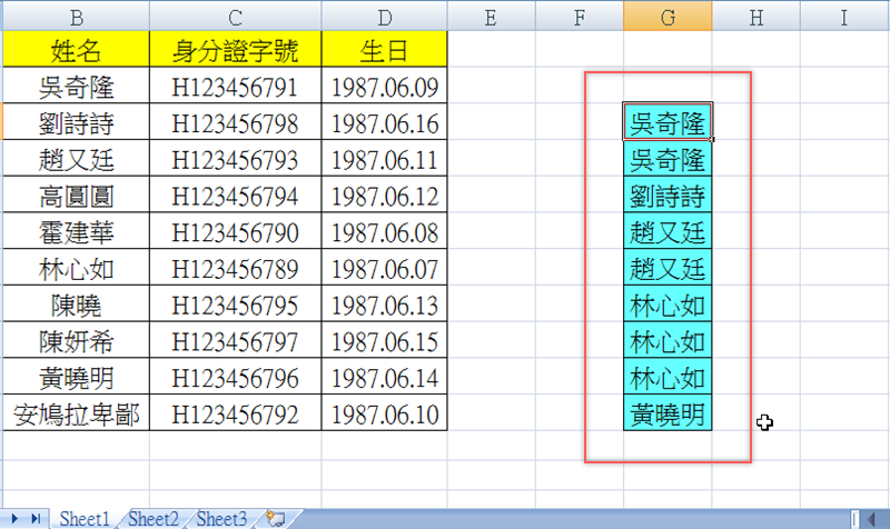 再做個實驗,假設我們的資料只有清單上的幾個人名,還有幾個是重複的,一樣按右鍵,選自訂排序。