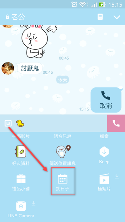在和朋友或是群組聊天的頁面,點擊左下角「+」號滑到最底下,找到「挑日子」的功能。