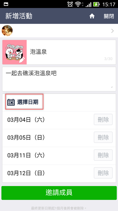 連結到新增活動,打上活動名稱及內容簡介,接著點「選擇日期」,建議不要列太多,可以先大概問過要參加的朋友們哪幾天方便,最後點「邀請成員」。