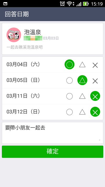 然後就可以回覆日期了,幾號可不可以、或是選 △ 表示不確定,下面也可輸入留言。