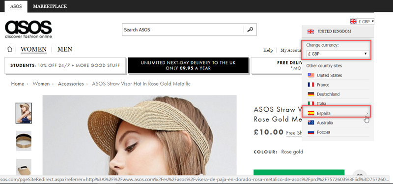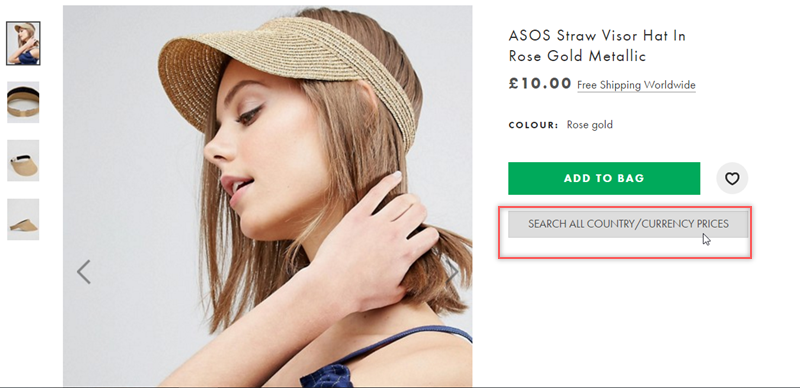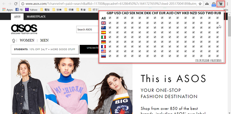 然後就到 ASOS 網站,點開右上角的購物車縮圖,一口氣將所有國家幣別點好點滿。