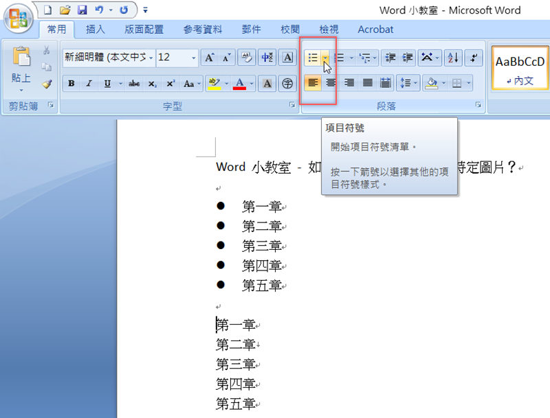 打開 Word 文件,到上排點開項目符號清單。