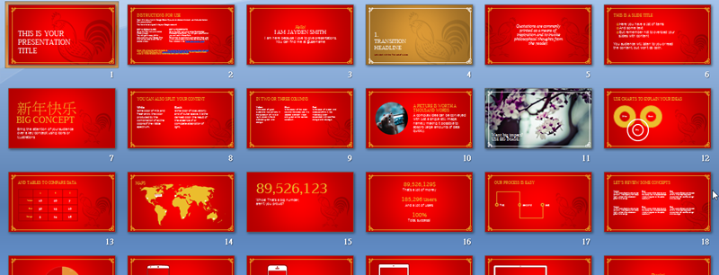 打開來發現有 18 張,但有 6 張是使用說明圖,其他張新年圖算是封面,沒有投影片內容的設計版型。