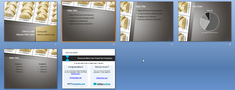 整體主題感覺比較傳統一點,優點就是都有三頁以上不同版,像這個錢幣的模板也是蠻常見的,還有附一個大餅圖可以拿來編輯,然後只要按讚分享就不用錢。