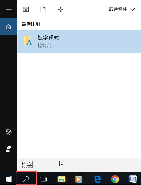 首先點左下角放大鏡符號,輸入「造字」就會跑出「造字程式」來。