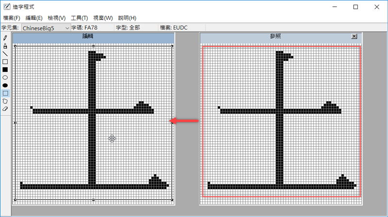 進到造字頁面,其實你可以用左邊那一排工具列上面的筆型符號,用寫的寫出來,但你試過就知道很容易歪掉,我們還是用阿湯之前介紹的方式來做比較好,到上排視窗點「參照」。