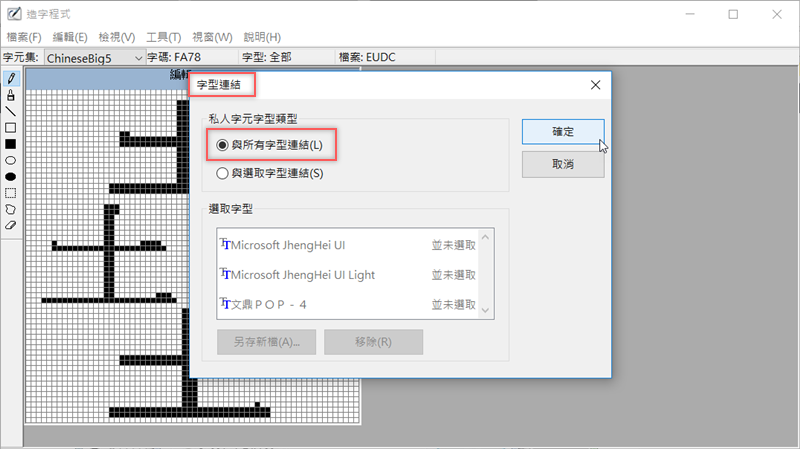 再到檔案→字型連結→選「與所有字型連結」,如果這裡沒有設定,就會發現只有使用剛剛造字的新細明體,才打得出來那個字。