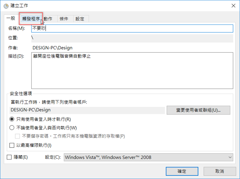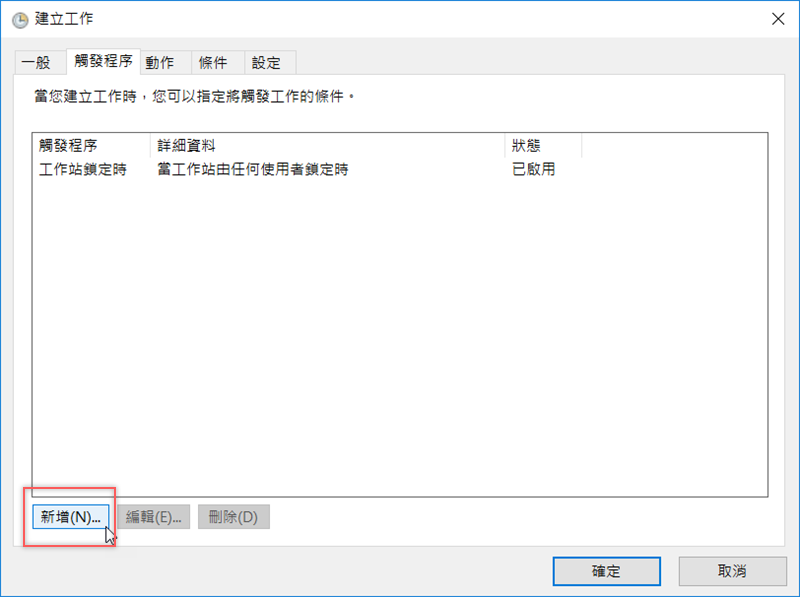 因為這個工作是關於電腦鎖定前後的動作,所以我們要再新增一個觸發程序。