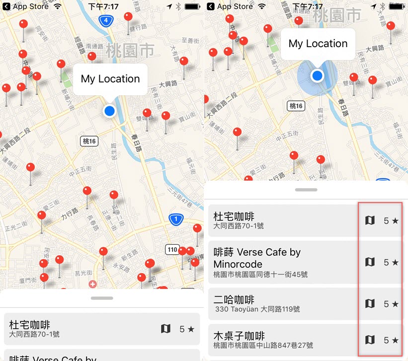 一開 APP 就會要求取得你的位置,定位後馬上顯示周遭有哪些咖啡廳,由下方清單往上滑可以看到咖啡廳的名稱與地址,並依評分排名(最高五分)。