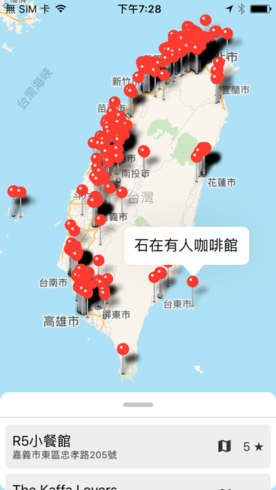 將地圖縮小可以看到全台都有顯示咖啡館的地點,密密麻麻的連綠島、澎湖也有。