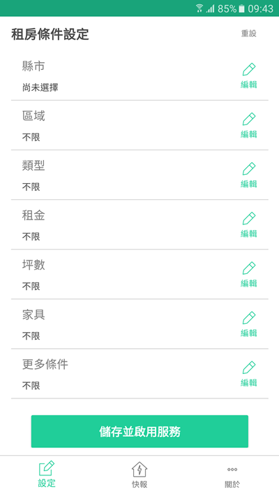 開啟首頁就可以進行租屋條件編輯,包括縣市、區域、類型、租金、坪數、家具等條件。