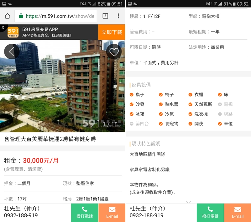 阿湯改掉搜尋條件中的「不要仲介」,才找到一筆比較適合的,點進去就連到 591 租屋網的內容,網站上有什麼就顯示什麼。