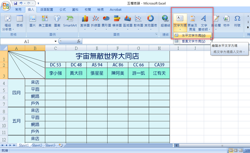接著要加入表頭內的文字,從插入頁面找到「文字方塊」,通常表格都會使用水平(從左到右)的文字,點「水平文字方塊」。