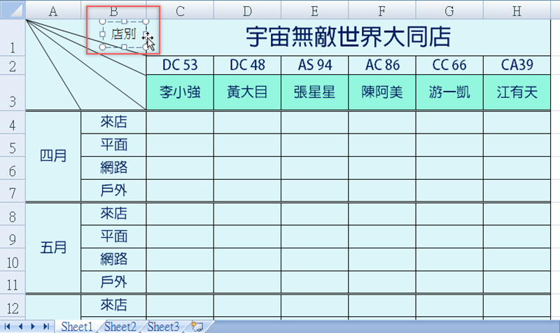 一般簡單的表頭,就像下圖一樣,可以用框線中的「繪製框線」在格子的對角拉一條線就好。