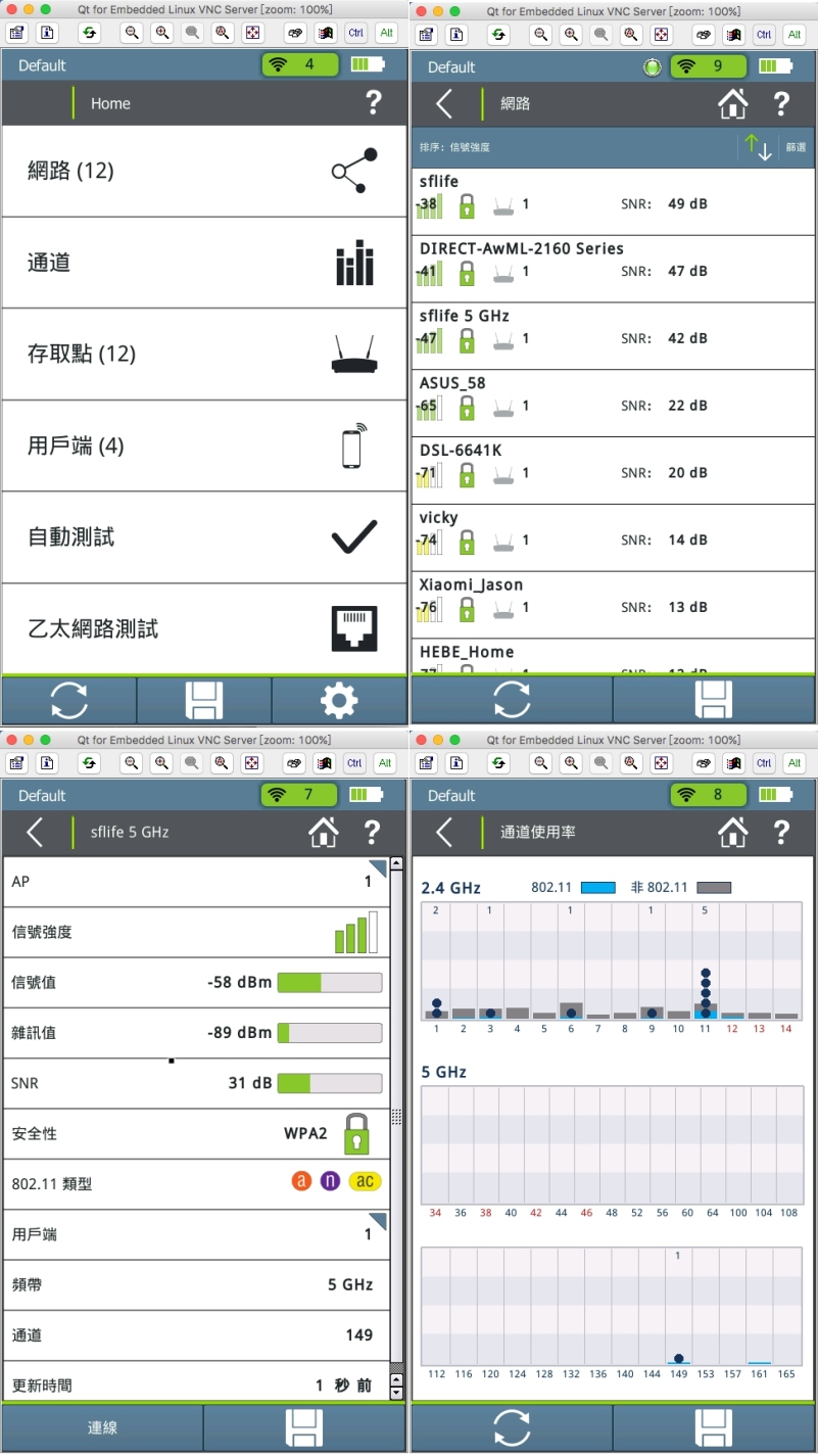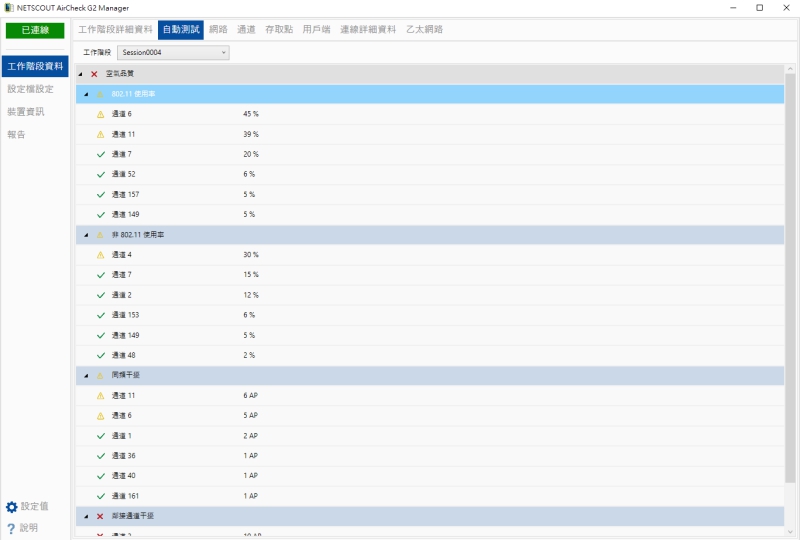 像是同頻段干擾是發生在哪些通道上等,這些都在測試儀上一目瞭然啊。