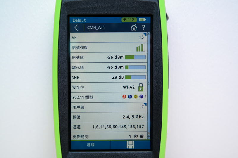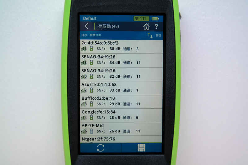 阿湯為了可以感受到這台測試儀的威力,也借了朋友的公司環境進行測試,一開機光看網路 SSID 就有 26 個,如果再細看的話,有些 SSID 更是包含 10 幾台 AP(就是利用漫遊進行延伸),從 AirCheck G2 最基本就能馬上查看所有 SSID 的 SNR(訊號雜訊比),還有每個 SSID 下共有幾台 AP,就能做初步的訊號源判斷。
