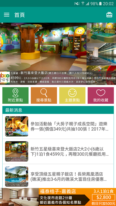 首頁主要是最新消息與好康快報,尤其可以知道一些飯店和遊樂區的限時優惠。
