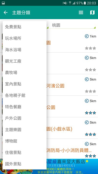 在主題分類的地方,可以先選一個地區,然後選擇搜尋條件,看是想玩水、逛農場、去遊樂園還是吃個飯、找地方住都有,還有國外景點,可惜點進去沒有內容,如果真的很想知道可以到官網看看。