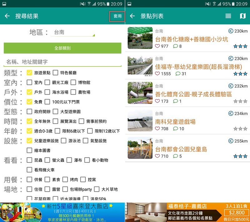 從左排功能列點「尋找景點」,可以更精確的依照不同的需求來篩選想去的地方,例如今天在台南想找戶外、適合 0-3 歲小孩的景點,還要有一些遊樂設施,選完點右上角套用,就會出現符合條件的地方了。