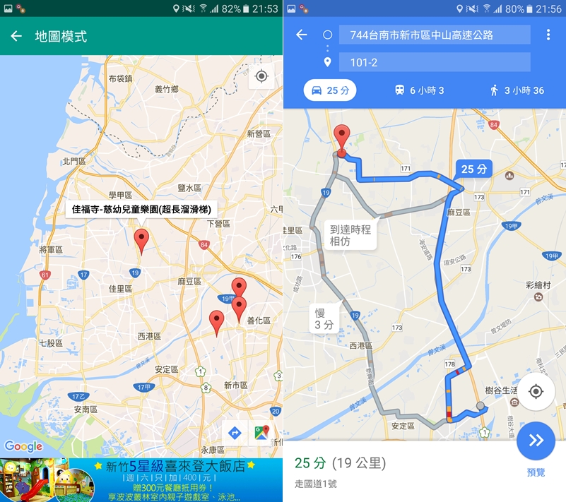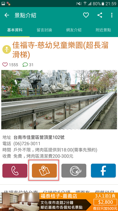 基本資料頁面可以從下方點電話圖示直接連絡園區,或點其他圖示連上官網和臉書,也可以規劃路線,假設我想去台南的這個超長溜滑梯(真的只有親子景點才會標榜溜滑梯),想知道怎麼走比較快,就點下面橘色的圖示。