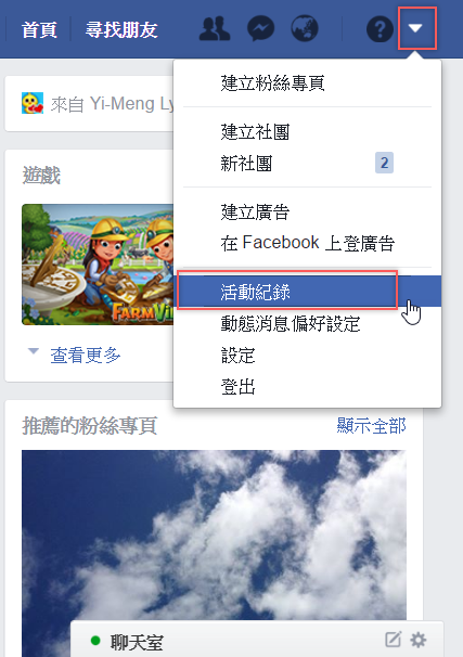 不管是用電腦還是手機上臉書,都可以在右上角找到活動紀錄,手機版的圖示是三條橫線,電腦版則是像下圖的倒三角形,打開後往下點進活動紀錄。