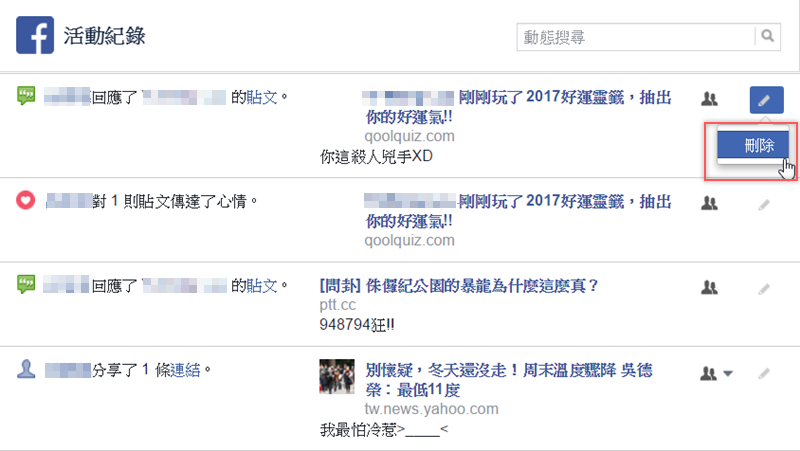 前幾天阿湯的朋友臉書帳號被盜,整個晚上都在其他人的動態牆發色情圖片和訊息,不知情的還以為他喝醉了在耍酒瘋,隔天發現才趕緊去每個朋友的頁面,一個一個點刪除留言收拾爛攤子,其實在臉書裡做的事情,包括留言、按讚、貼文都會留在「活動紀錄」裡,從這裡就可以對自己或其他人留下的內容進行編輯,不用在不同頁面跑來跑去浪費時間,平常也可以在這裡檢查有什麼奇怪的留言,避免訊息太多被覆蓋。