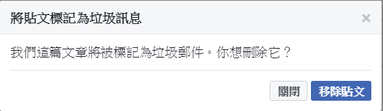 如果點「檢舉∕標示為垃圾訊息」,就會出現這個確認視窗,再點「移除貼文」就可以徹底刪除了,以後再遇到陌生人或是朋友的白目留言,就不用辛苦的爬文慢慢找了。
