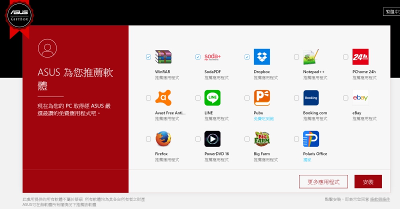 對於女生來說,新電腦買回來大多會不知道怎麼安裝一些常用工具,像是壓縮軟體、防毒軟體等,ASUS 也很貼心的準備 GIFBox 這工具,讓你直接選取需要的軟體一鍵就能進行安裝,輕鬆搞定。