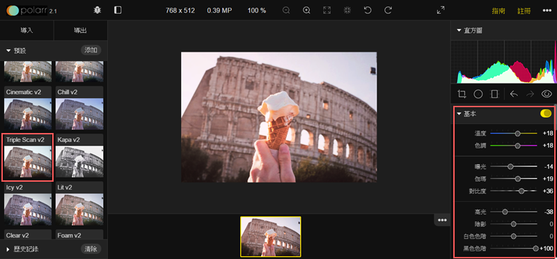 接下來就可以開始玩了,先在左邊選一個喜歡的濾鏡,阿湯選了 「Triple Scan v2」,然後在右邊調高溫度、色調、伽碼、對比等,減低曝光、高光再增加黑色色階。