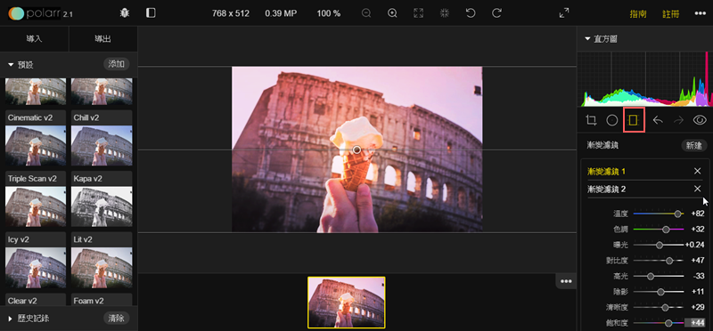 就進到 Polarr Plugin 裡了,最上排可以縮放、旋轉、改全螢幕,左排主要是各種濾鏡,右排則是直方圖檢視和各項細節調整。