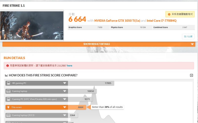 針對跑分的部份,透過 3DMark 的 Fire Strike 1.1 得到 6664 分,這樣的分數在電競筆電中算是位於中高階的表現了。