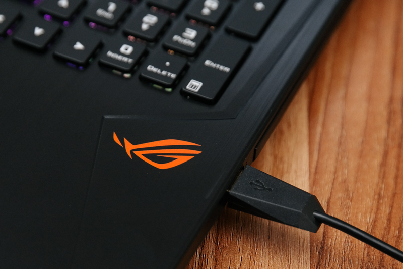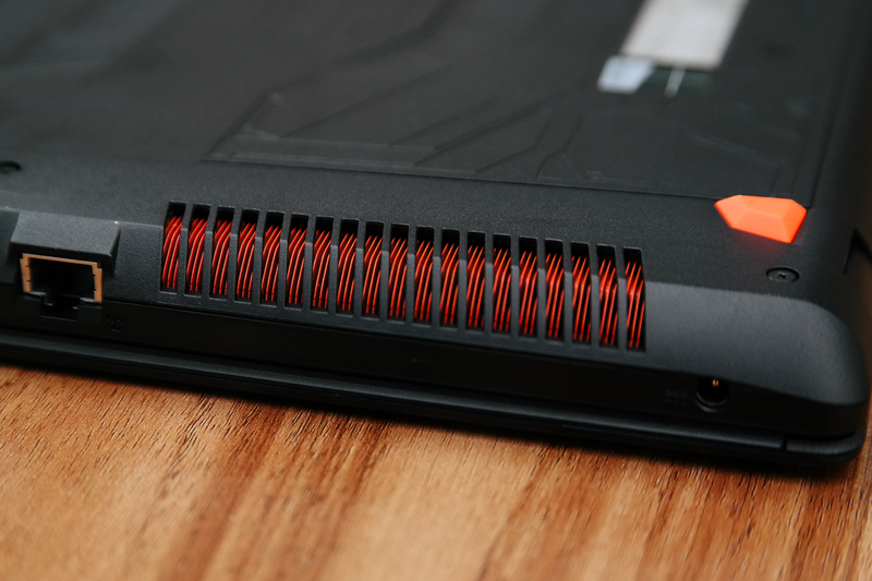 散熱孔分別在底部有四排,側邊有一個,內建 ROG 獨家的 Cooling Overboost 散熱技術,可調整風扇速度,加上智慧散熱設計,讓玩家在執行需要高效能的遊戲同時,仍然保有很好的穩定性。